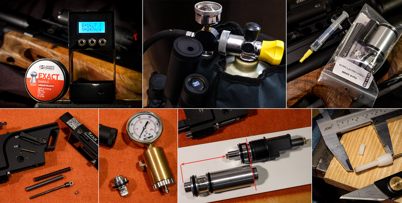 With compact size and stunning off-hand shootability it seems to be good choice for HFT, doesn’t it? But shot count and fps stability through the full shot string is crucial for HFT. With original reg dialed down to 100 bar I was able to get 85-90 good shots but that system was optimized for 40-50 fpe (big plenum), so there was some fps peak at the end of shot string. To prevent that I decided to install an HFT specific 12fpe reg & plenum system by HUMA. It’s a very clever system, which works with low reg pressure and really restricted plenum. So not only it gives roughly 70mm of additional tube length for air, but also prevents that peak at the end of shot string as it empties all air from plenum with each shot. I’m still working on my final tune (my setup was kind of prototype) but I’m getting now up to 120-130 shots (!) from 250 to 90 bar... and hoping for 140+ yes! Any downside? Well, you can’t go much higher than 12fpe with that system and it’s semi-permanent mod (to go back you need to purchase new valve stem, which must be shortened for HUMA system) but for me it’s fine as I want my Lelya to be sub 12 fpe airgun.