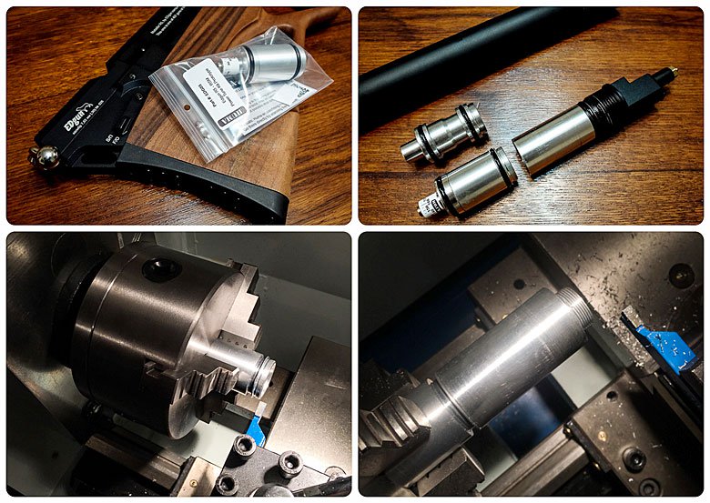 Long story short, I was asked by my buddy, an airgun tuner from New Zealand, if I’d be willing to take part in HUMA’s development for the R5 (HUMA is a world leading company in internal tunings for PCP airguns). So I tried my lathe operating skills and built a hybrid of the original plenum and valve to use with HUMA’s regulator.