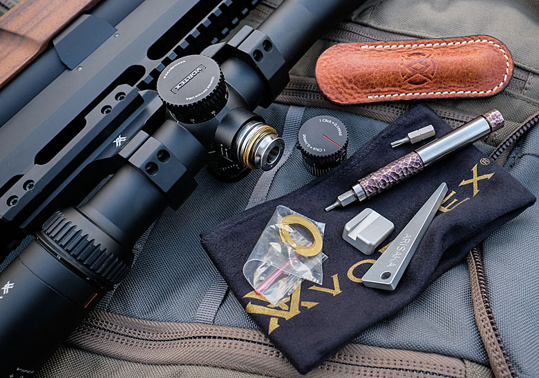 I knew I’d be dialing in my shots quite a lot, so I put the brass zero-stop rings on my up/down turret for easy re-zeroing. (This feature is amazing!) Overall, I’m extremely pleased with this big piece of glass from Vortex. It’s a very shootable one, with a great reticle and no-questions-asked lifetime warranty. As a final note, for ballistic calculations I use the Strelok Pro app on my iPhone. It’s not free but it’s one of the best and has all the Vortex scopes and reticles in a database.